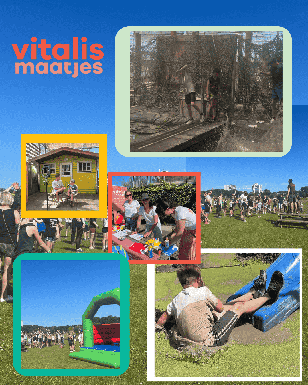 Na een voedzame lunch—natuurlijk met patatjes mét—ging het feest vrolijk verder. In de middag was het tijd voor het langverwachte modder- en kroostraject! En ja hoor, daar werd gretig gebruik van gemaakt. Sommige kinderen deden zelfs hun best om juist níet droog te blijven. ?
